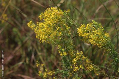 Galium verum yellow flowers in the meadow on summer. Close-up of yellow bedstraw