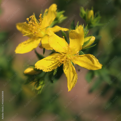 St. John's wort plant with beautiful yellow flowers. Hypericum perforatum in bloom on summer