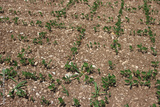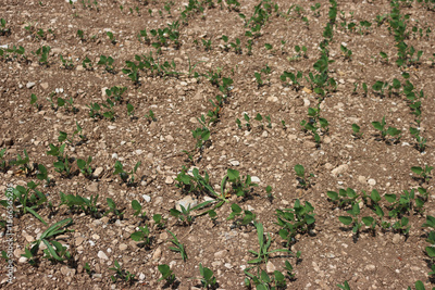 Green soybean plants in row growing in the field . Agricultural field in summer on a sunny day