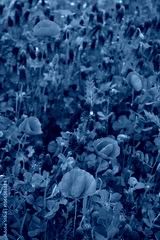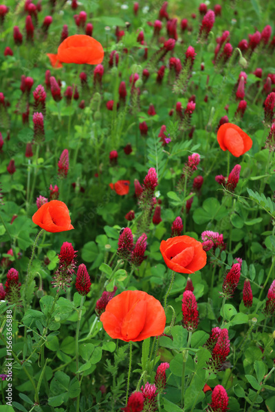 Crimson clover field in bloom with many red poppies . Trifolium incarnatum field on springtime season