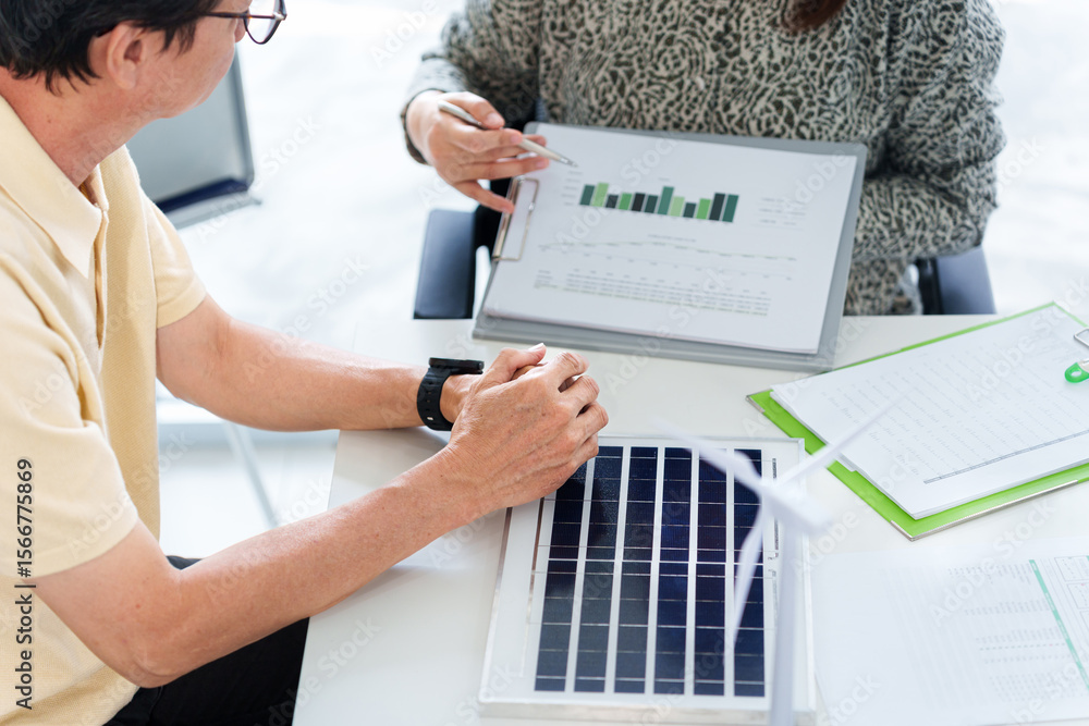 Asian adults review ESG reports discussing renewable energy solutions and sustainable business practices for corporate responsibility