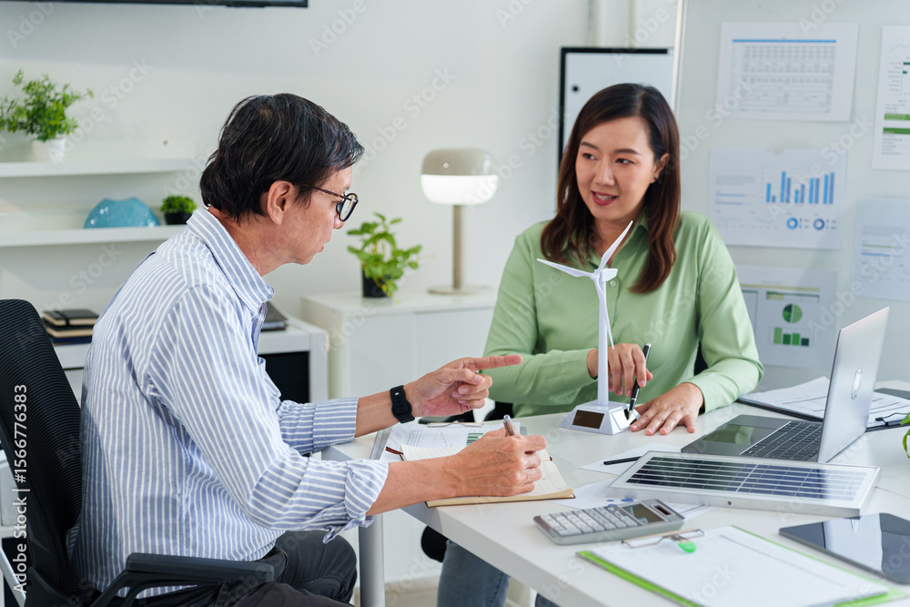 Asian Business Executives Analyzing Renewable Energy Investments and ESG Sustainability Strategies in a Collaborative Office