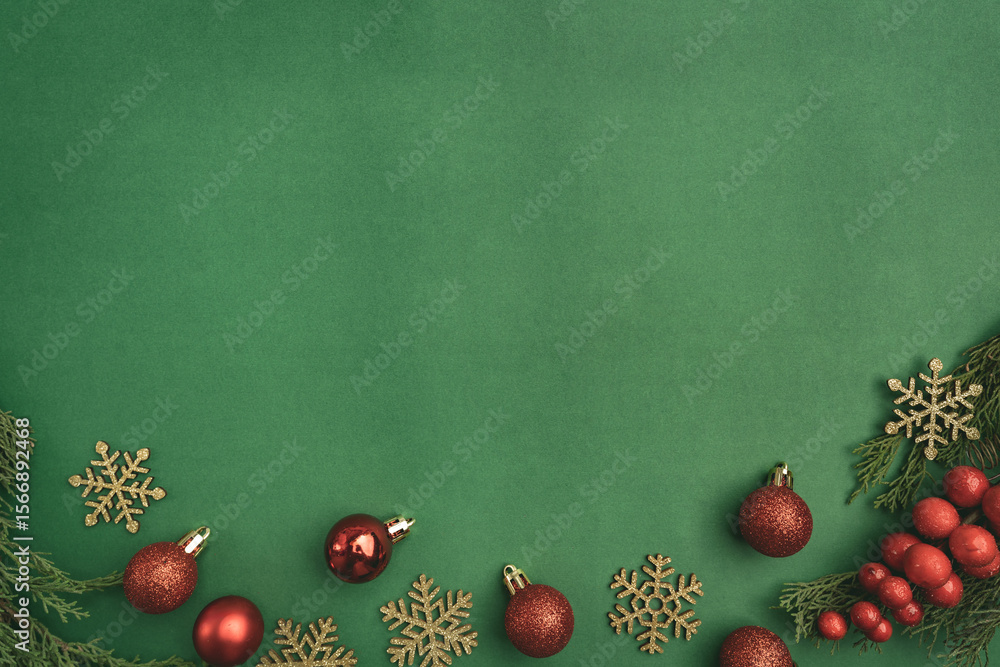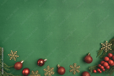 Christmas and Happy New background with red glitter decorations on green bright background. Holiday party decoration . Christmas celebration, holiday card
