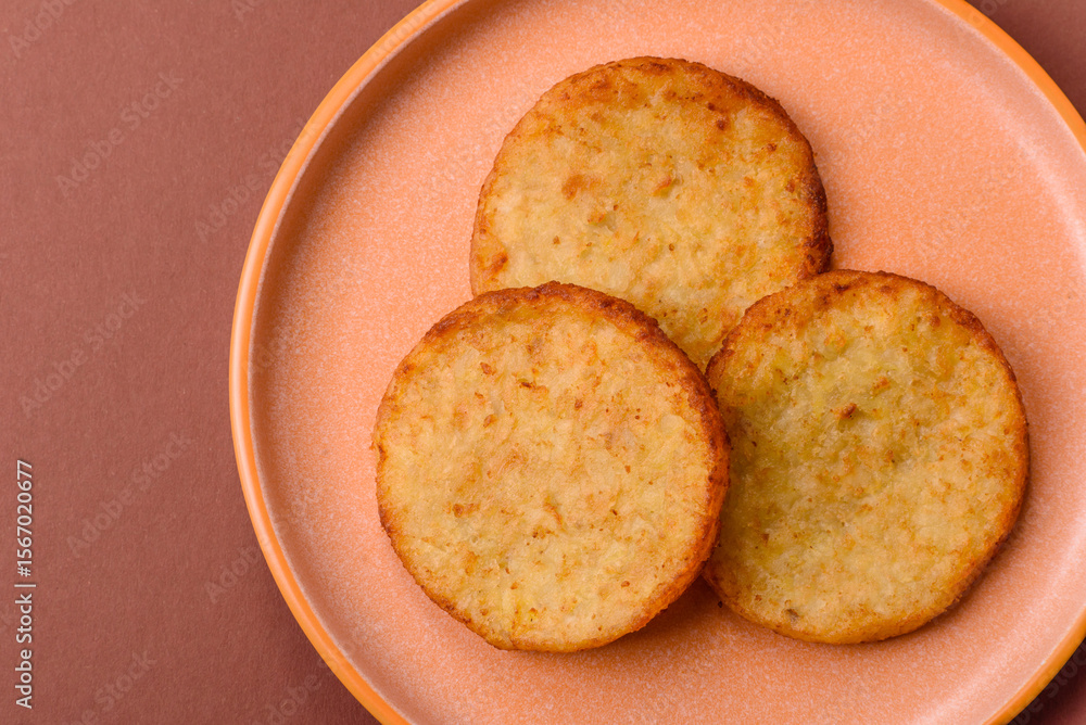 Hash browns, a breakfast food made of potatoes, onions and vegetables. Hash browns with potatoes