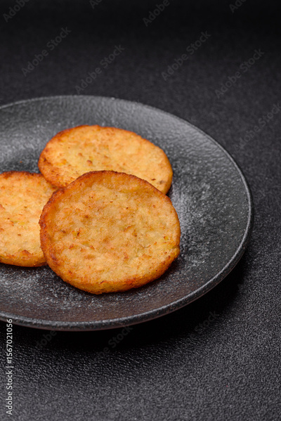 Hash browns, a breakfast food made of potatoes, onions and vegetables. Hash browns with potatoes