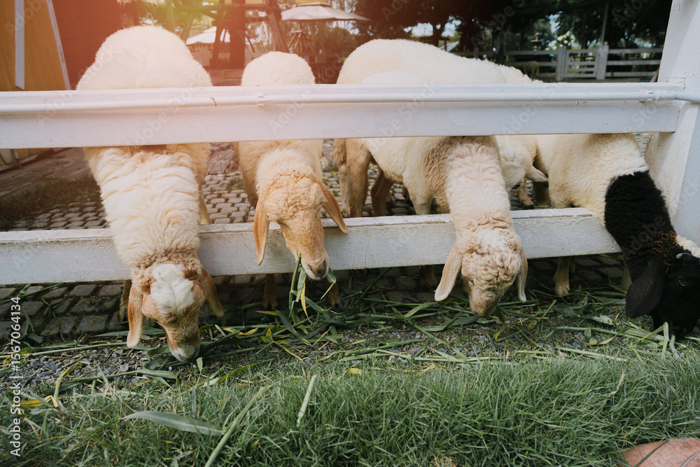 Four sheep grazing on grass with heads through a fence in a serene farm environment during daytime
