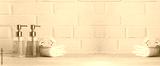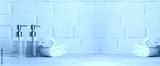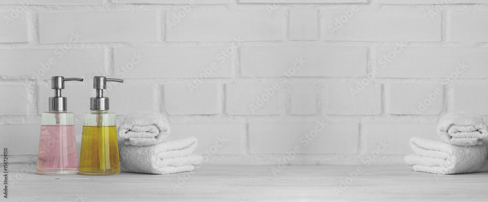 Cosmetic products and cotton towels on white wooden table -piece of spa interior, beauty salon. Copy space. Wide panoramic image.