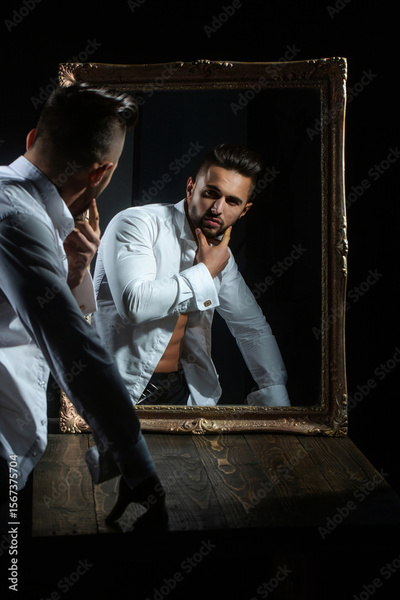 Fashion male model with hot naked body in white shirt. A sexy man in an unbuttoned white shirt on black background. Handsome muscular man with naked torso and shirt. Guy with with open shirt.