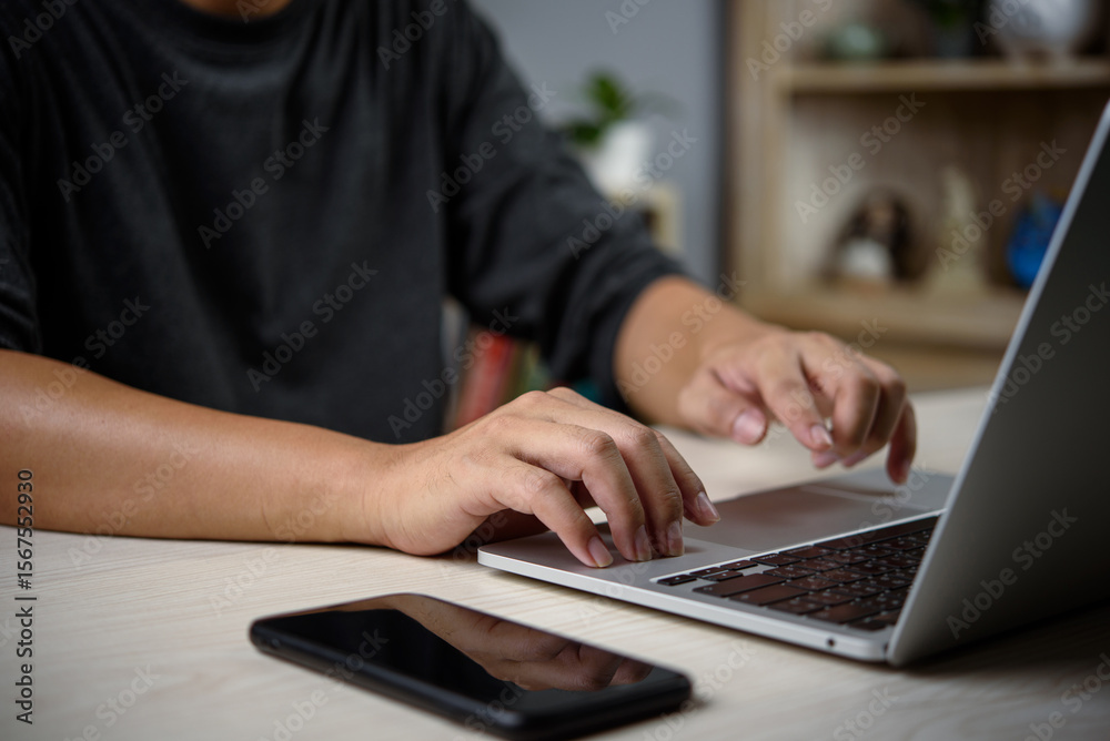 Close-up of hands typing on computer keyboard, casual attire, data entry, virtual meeting, online education, e-commerce, digital nomad, market research, global connectivity.