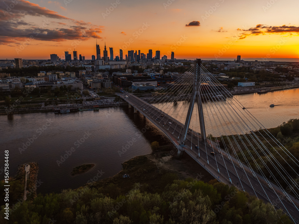 Warsaw city center and skyscrapers in the background Vistula river and Swietokrzyski bridge. Sunset Warsaw aerial view.