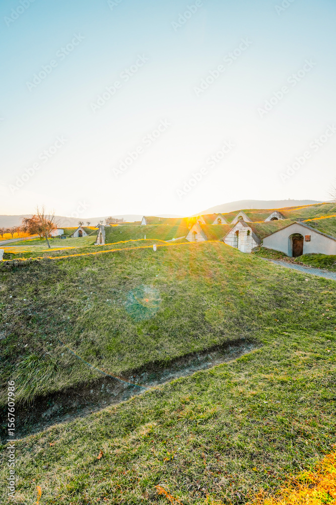 Traditional wine cellars in Hercegkut near Sarospatak Tokaj region Hungary. Button Hill.
