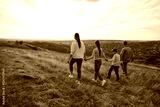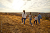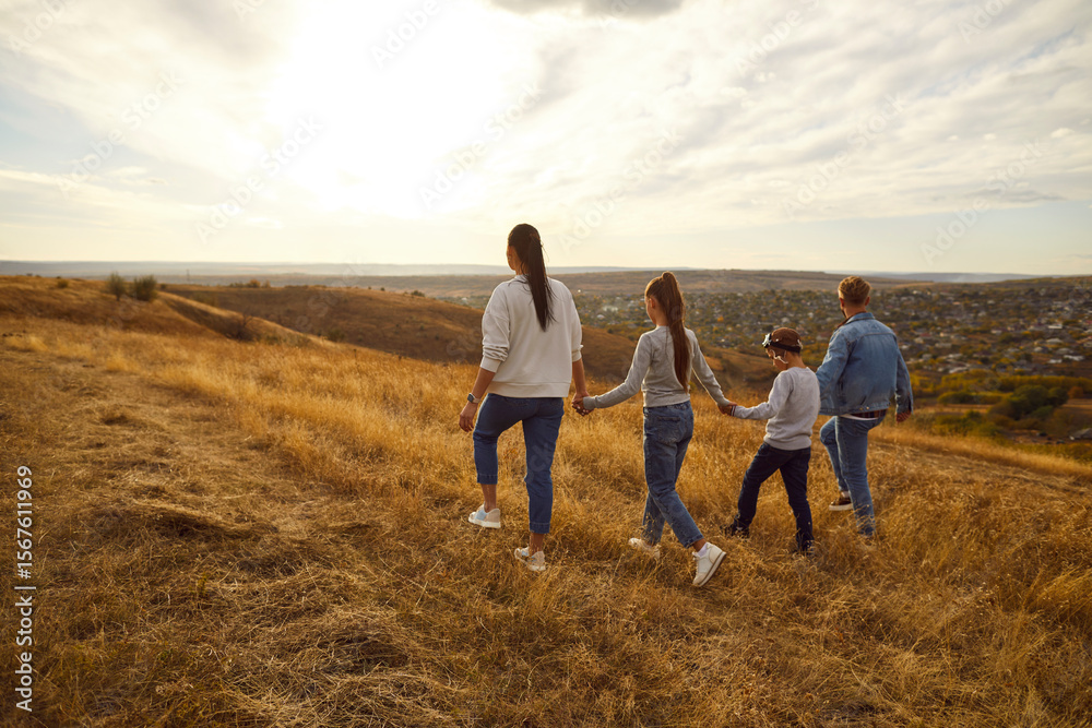 Back view of family holding hands and walking on field during sunset, spending free time outdoors, strolling in nature, enjoying quiet autumn day. Family leisure and lifestyle concept