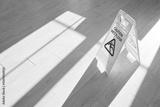 High angle above indoor inside yellow Caution Wet Floor sign with man figure stands on clean tidy freshly mopped slippery light grey wood, laminate or linoleum surface with window sunlight and shadows