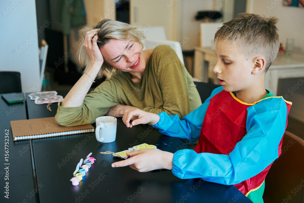 Child painting wooden christmas ornament with his mother at home