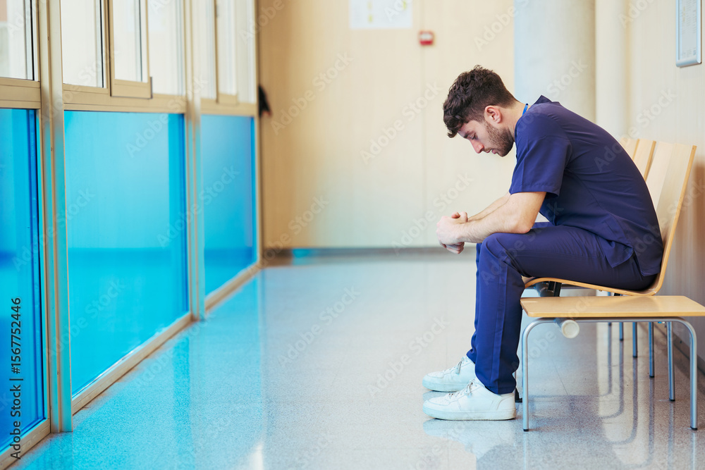 Tired doctor sitting in hospital corridor reflecting on difficult cases