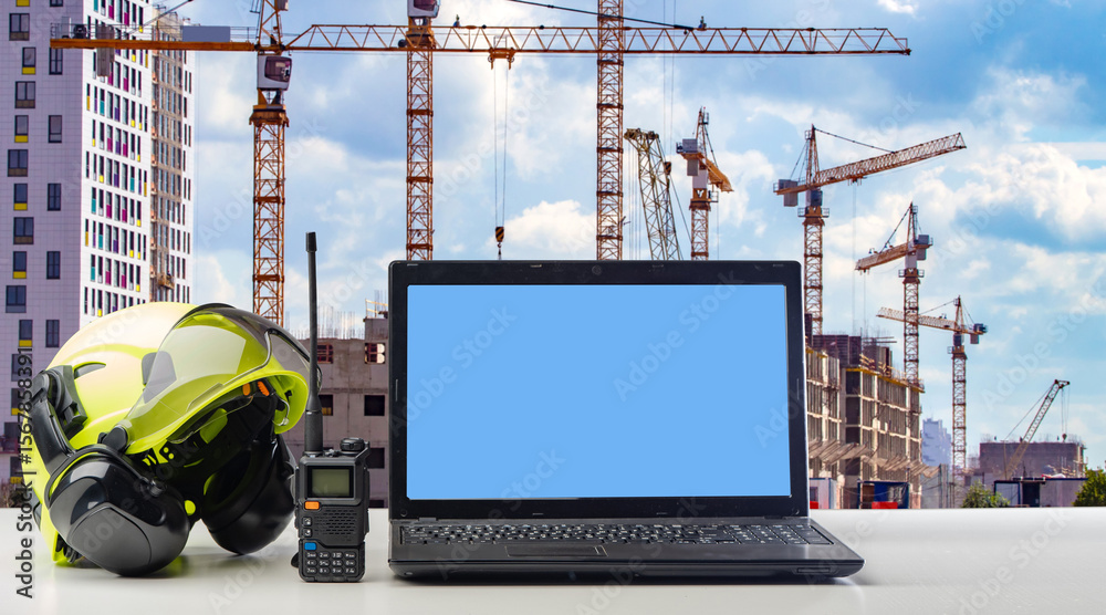 Laptop, helmet and radio on table at construction site with cranes and buildings in background, representing planning and supervision. — Construction. Engineering. Supervision.