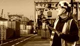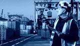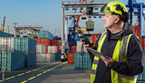 Dock supervisor in safety vest and helmet using walkie-talkie and tablet at busy container port managing cargo logistics and crane operations. — Port. Logistics. Cargo handling.