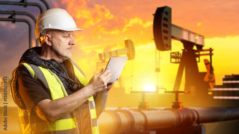 Engineer in safety gear uses tablet at oil field during sunset, monitoring pump jacks and pipelines. Activity: Oil extraction, energy production, industrial monitoring.