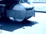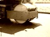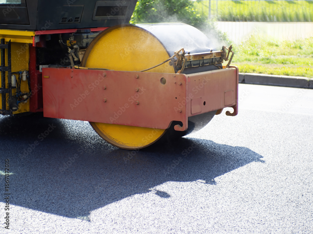 Asphalt paver roller. Road construction machine. Asphalt paver fragment during operation. Road construction equipment. Asphalt paving on sunny city street. Cropped road paving machine