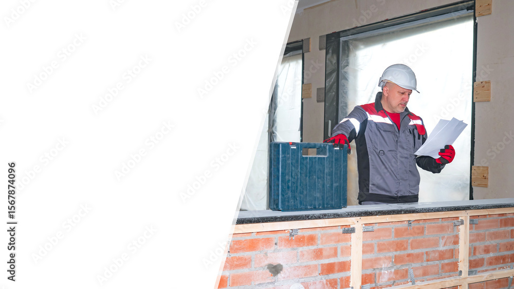 Man builder inside building under construction. Architect with papers near brick wall. Experienced builder in gray uniform. Design engineer checks documents. Portrait of focused man builder