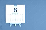 Calendar page for August 2026 with wood easel on orange color background.