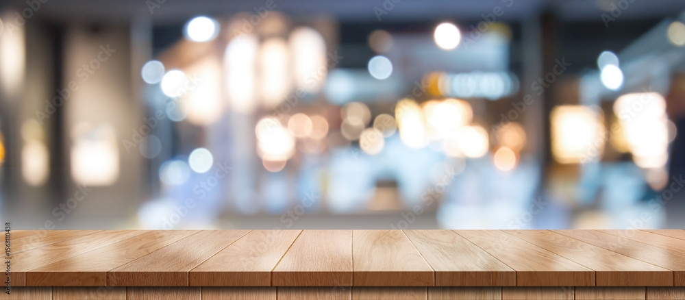 Empty wooden table with bokeh light effect and blur restaurant background, for your photo montage or product display, Space for placing items on the table, product and food display.