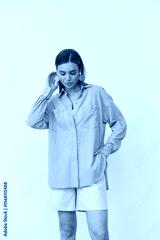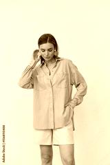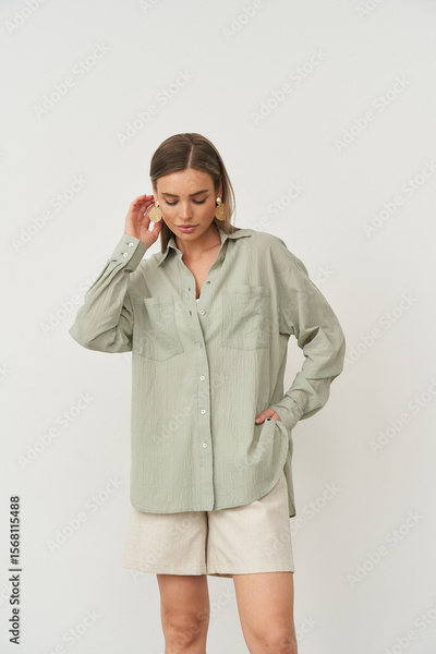 Stylish woman posing indoors in fashionable attire during a studio photoshoot