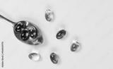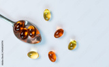 A close-up, top-view image of golden fish oil capsules on a silver spoon, isolated on a clean white background. This flat lay composition represents the concept of daily nutritional supplements.