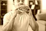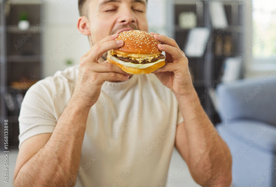 Hungry man eating delicious big burger at home. Young happy guy holding cheeseburger at mouth to bite, eat and enjoy unhealthy yummy sandwich, takeaway junk food. Love for fastfood, hunger concept