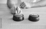 Decision and choice making concept. Unrecognizable man sits at table and select between two distinct options represented by Yes and NO colored buttons, closeup view