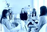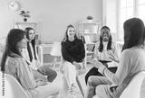 Happy women hold work meeting or conversation with psychologist during office session in circle, communication and psychology support, supportive atmosphere with togetherness and emotional well-being.