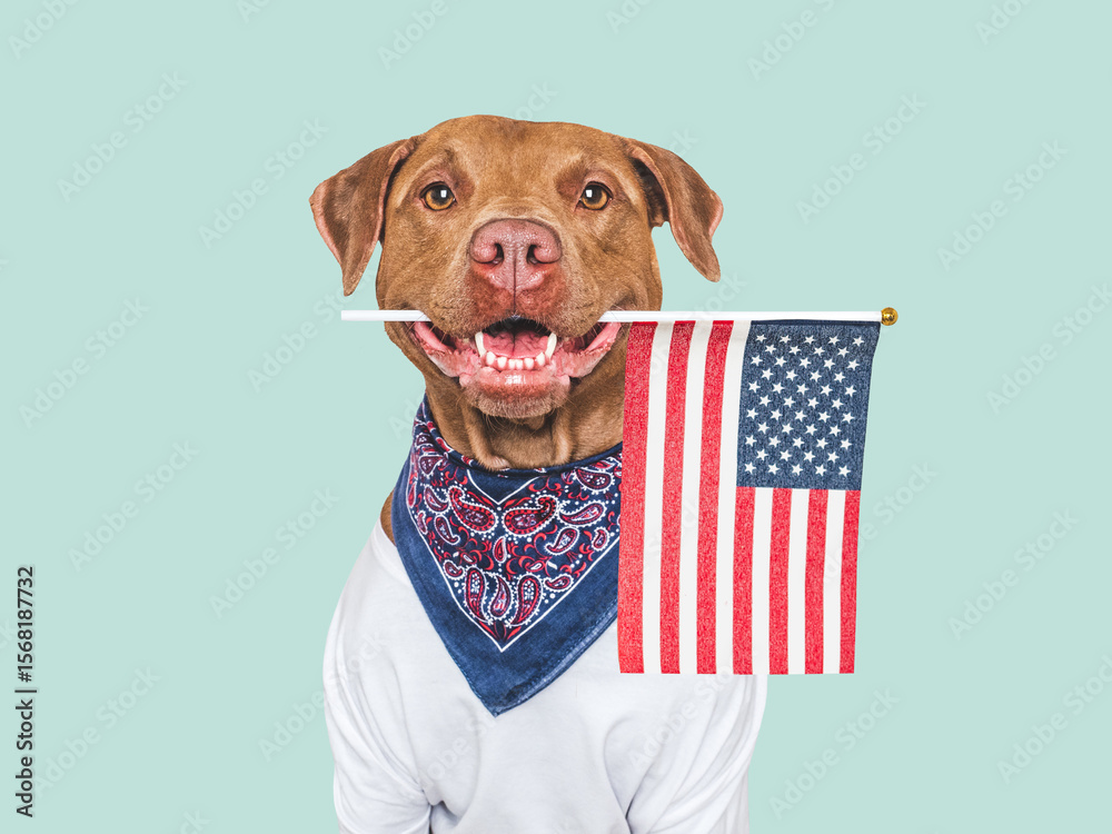 Cute dog holding American Flag. Closeup, indoors. Studio shot. Congratulations for family, loved ones, relatives, friends and colleagues. Beauty and fashion concept. Pets care