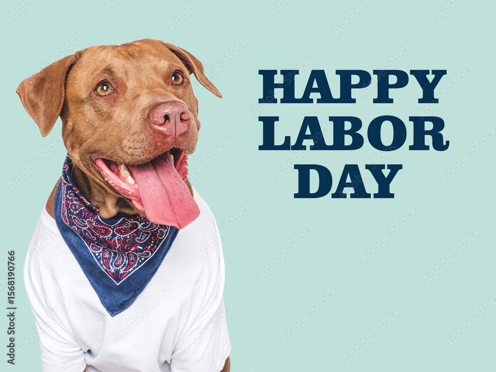 Happy Labor Day. Cute dog and congratulatory message. Close-up, indoors. Studio shot. Congratulations for family, relatives, loved ones, friends and colleagues. Pets care concept
