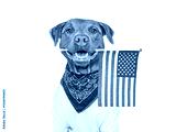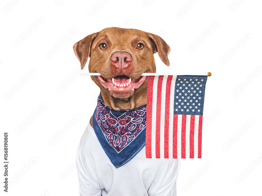 Cute dog holding American Flag. Closeup, indoors. Studio shot. Congratulations for family, loved ones, relatives, friends and colleagues. Beauty and fashion concept. Pets care