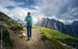 Young woman hiking along a mountain trail, carrying a backpack while savoring the breathtaking views of Tre Cime di Lavaredo and the stunning Dolomites landscape in Italy