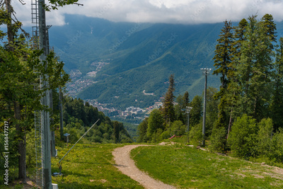 Gorgeous landscape in the mountains with snow-capped hills and clouds over the peaks of the mountains, Sochi, Krasnaya Polyana