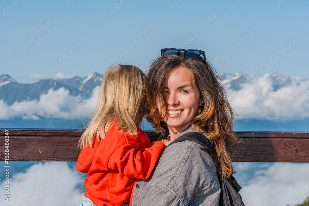 A young mother with her three-year-old child daughter goes to the mountains on Krasnaya Polyana in Sochi in the summer. The concept of tourism, family holidays