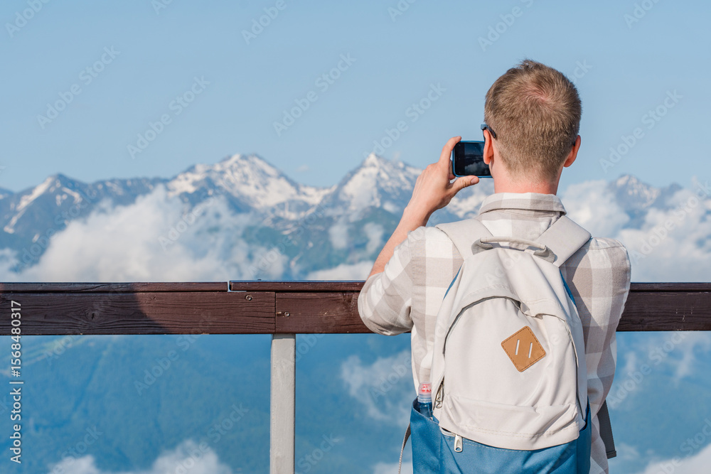 A man takes pictures and enjoys the view of the picturesque landscape of mountain slopes with clouds.