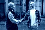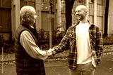 Two generations connect through warm handshake on leaf-strewn sidewalk, Friendly encounter between two men, Casual business partners solidify agreement with handshake during fall season
