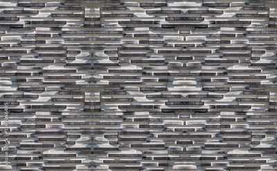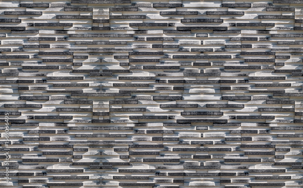 A close-up shot of a textured stone wall made of rectangular bricks in different shades of gray and white, giving it a rugged, worn-out look. The sunlight casts soft shadows