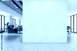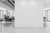 Blank white wall mockup in modern corporate office interior with wooden floor and glass windows offering city view, perfect for logo or poster display. 3D Rendering