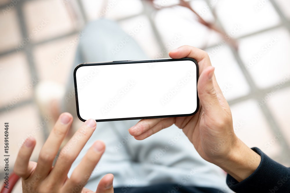 Hand touching white screen smartphone holding horizontally watching videos or playing game on bench.
