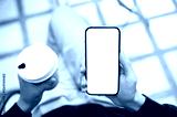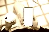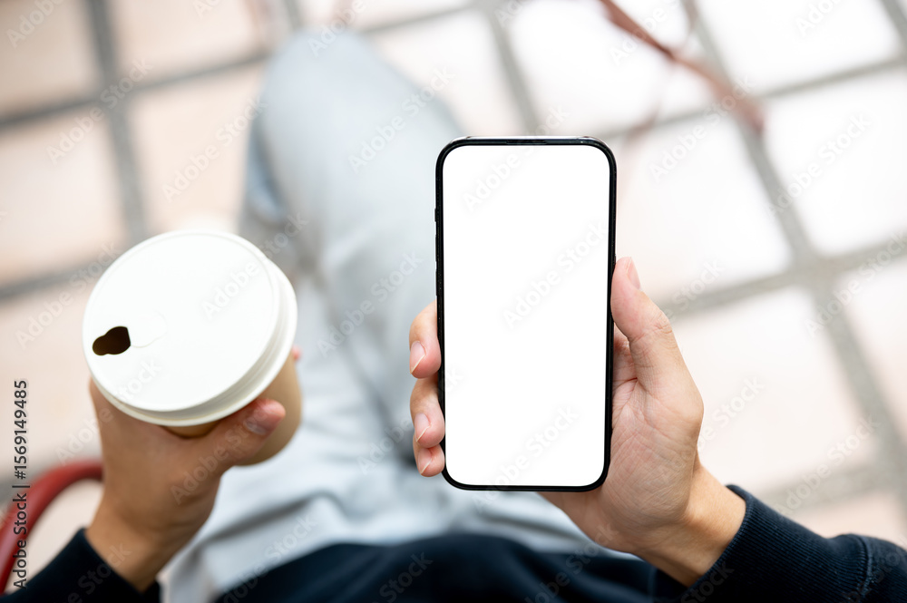 Hands holding coffee and white screen smartphone using application or social media as sits on bench.