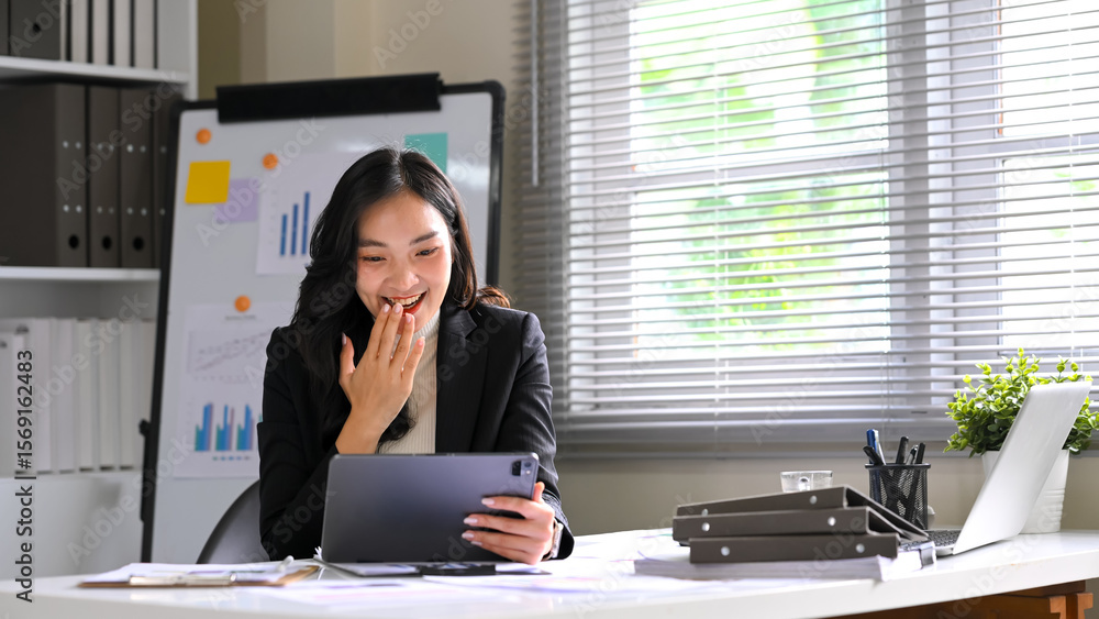 Surprised businesswoman with hand over her mouth after seeing positive results on digital tablet