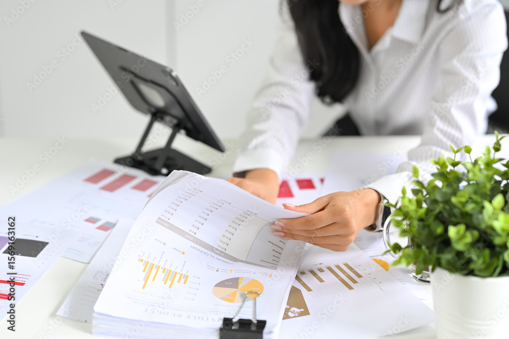 Businesswoman hands analyzing charts and graphs at a bright office desk