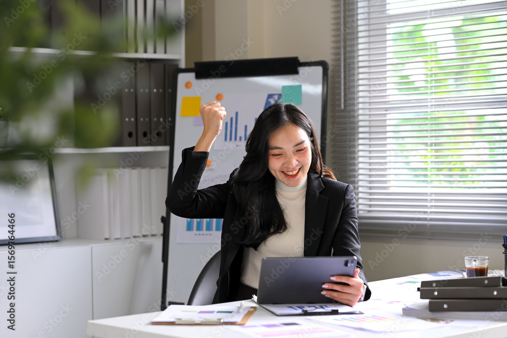 Motivated businesswoman expressing joy and success in a bright, contemporary workspace