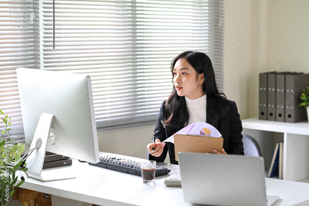 Focused businesswoman analyzing financial charts at a modern office desk with a computer