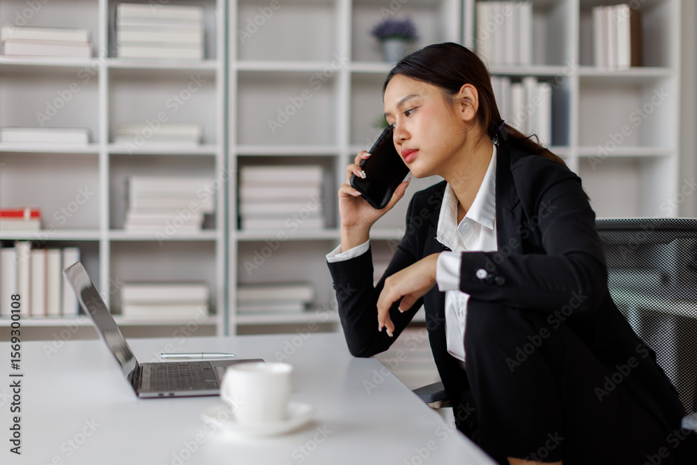 Stressed woman on phone working at workplace desk with laptop. listens client claims feels displeased annoyed and anxious, problems at work concept