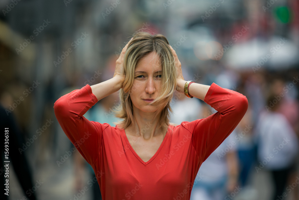 A close-up portrait of a woman standing in the middle of a crowded street, covering her ears with her hands. Her gesture creates a quiet, personal space amid the surrounding noise and movement.