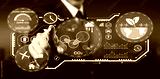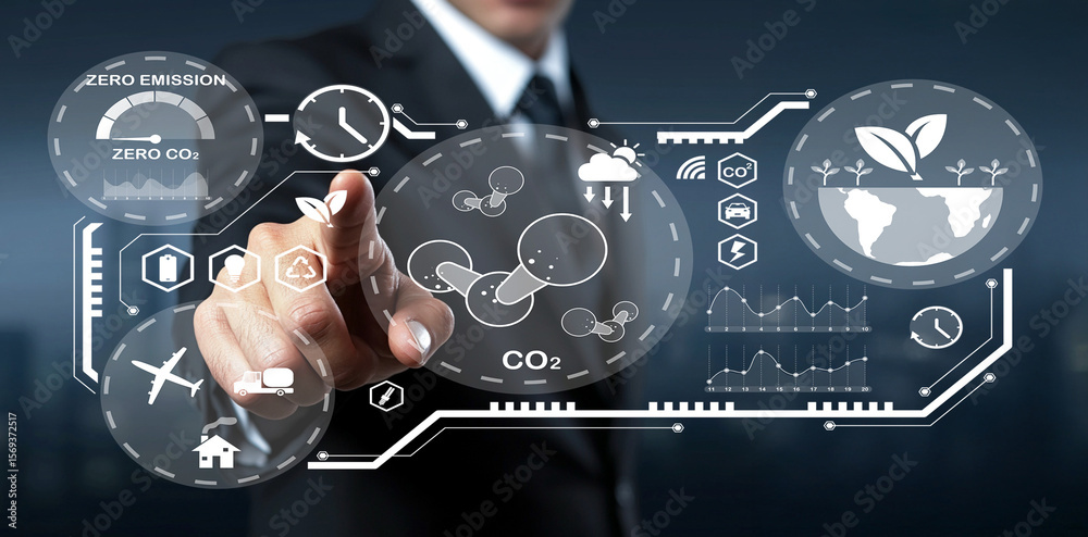 Businessman Interacting with Innovative Technology Interface Displaying Sustainable Development, Environmental Impact, and Data Analytics Concepts in Modern Office Space